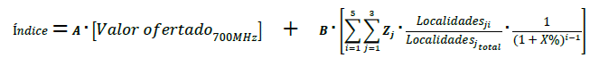 En la que el valor A, B, Zj, X% y LocalidadesjTotal son parámetros conocidos en la Resolución 3078 de 2019. El Valor Ofertado y Localidadesji, era la oferta que debía realizar el participante. El valor ofertado es un precio u oferta en efectivo, mientras que las localidades es el número de poblaciones a las que se compromete a dar cobertura bajo unas especificaciones técnicas definidas. A partir de lo anterior, se establecía el índice con el que pujaba en cada ronda de la subasta, para ello, el participante debía configurar una oferta que superara el índice de reserva, no conocido para él, y así hacer parte de la puja en cada caso concreto. Que el índice de reserva no sea conocido garantiza que, en efecto, se dé cumplimiento al mandato de maximizar el bienestar social en la asignación del recurso escaso, en otras palabras, que realmente haya competencia en la asignación del recurso. Así, el valor del índice reserva no conocido antes del evento de subasta, y definido en $151.523.769.879 por cada uno de los bloques de 20 MHz en la banda de 700 MHz refleja el valor de reserva del bloque y la cantidad mínima de localidades a cubrir del tipo 1 en el año 1, como factores para valorar la ampliación de cobertura en cuanto a su cantidad, complejidad de acceso, condiciones socioeconómicas y costo de oportunidad del tiempo tomado para el despliegue. De este modo, ofertas con localidades de otros tipos (2 y 3) y a desarrollarse en mayor tiempo (años 2, 3, 4 y 5) se reflejaban en la necesidad de cubrir mayor cantidad de localidades o, incluso, ofrecer mayor cantidad de dinero.