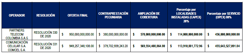| PARTNERS TELECOM COLOMBIA S.A.S | RESOLUCIÓN 330 DE 2020 | $ 380,000,000,000.00 | $ 841,152,000,000.00 | $ 1,221,152,000,000.00 |