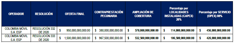COLOMBIA MÓVIL S.A ESP resultó ganador de un (1) bloque de veinte (20) MHz en la banda de 700 MHz en la secuencia numero tres (3). con una oferta final por concepto de contraprestación económica por el derecho de uso del espectro radioelectnco de NOVECIENTOS CINCUENTA MIL MILLONES DE PESOS (950.000.000.000,00 COP), dividida en TRESCIENTOS OCHENTA MIL MILLONES DE PESOS (380.000.000.000,00 COP) como contraprestacion pecumana y en la ampliación de cobertura del servicio móvil en cero (0) localidades en un (1) año. doscientos ochenta y dos (282) localidades en dos (2) años doscientos setenta y dos (272) localidades en tres (3) años, doscientos setenta y tres (273) localidades en cuatro (4) años y doscientos setenta y dos (272) localidades en cinco (5) años, de acuerdo con la oferta realizada por COLOMBIA MÓVIL S.A ESP
