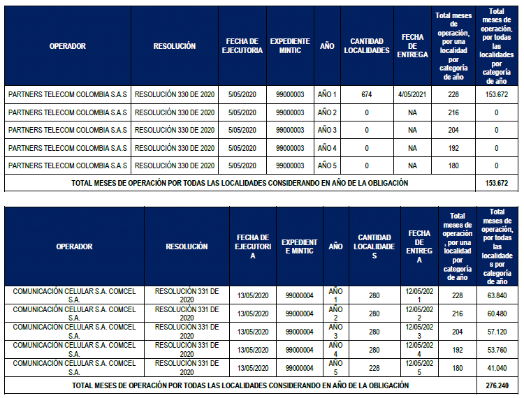 | COMUNICACIÓN CELULAR S.A. COMCEL S.A. | RESOLUCIÓN 331 DE 2020 | 280 | 280 | 280 | 280 | 228 | 1348 |