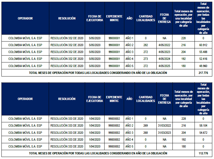 | COLOMBIA MÓVIL S.A. ESP | RESOLUCIÓN 332 DE 2020 | 0 | 282 | 272 | 273 | 272 | 1.099 |