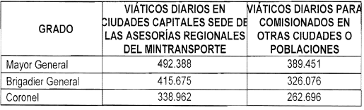 ARTÍCULO 9o. ESCALA DE VIÁTICOS. A partir de la vigencia del presente decreto, fíjese la siguiente escala de viáticos para el personal de la Policía Nacional destinado para prestar sus servicios como Policía de Tránsito y Transporte adscrita al Ministerio de Transporte que deba cumplir comisión en el territorio nacional así: