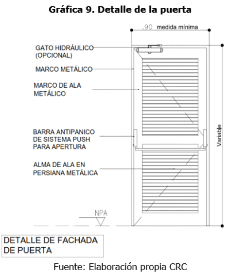 Nivel de descarga: Parámetro que se refiere al piso o altura del tramo final de un medio de evacuación y un lugar seguro respecto al nivel de la vía pública. Se permitirá que haya un desnivel máximo de 1,50 m entre el nivel de descarga y la vía pública siempre y cuando se garantice una conexión por medio de una escalera o rampa.