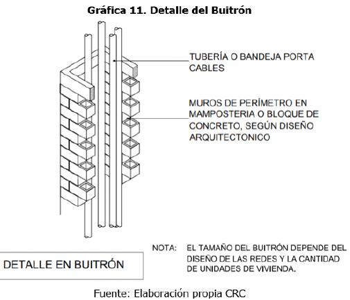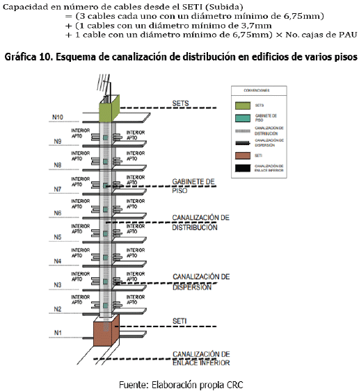 Canalización de distribución: Parte de la infraestructura soporte de la red interna de telecomunicaciones del inmueble, compuesta de un conjunto de ductos, canaletas, bandejas, escalerillas y demás elementos necesarios para interconectar los salones y/o gabinetes de equipos de telecomunicaciones con los gabinetes de piso, soportando el tendido de los cables de la red de distribución del inmueble. La canalización de distribución en edificios es de tipo vertical, en el caso de conjuntos de casas su distribución será de tipo horizontal. Su diseño y construcción es responsabilidad del constructor del inmueble.