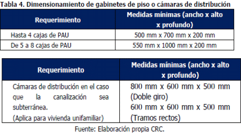 Canalización de dispersión: Elementos de la infraestructura soporte de la red interna de telecomunicaciones del inmueble. Conjunto de ductos, canaletas, bandejas, escalerillas y demás elementos necesarios de la infraestructura que soporta la red interna de telecomunicaciones del inmueble para interconectar los gabinetes de piso con las cajas de punto de acceso al usuario de cada vivienda. Está destinada a soportar el cableado de la red de dispersión del inmueble. En ella se intercalan las cajas de paso, que son elementos que facilitan el tendido de los cables entre los gabinetes de piso y las cajas de punto de acceso al usuario. Su diseño y construcción es responsabilidad del constructor del inmueble.