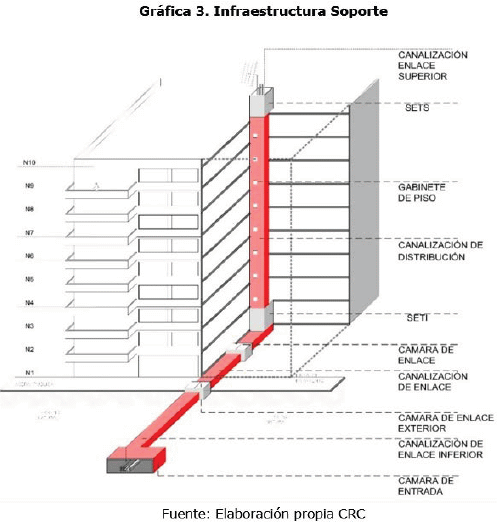Infraestructura soporte: En el contexto de la red interna de telecomunicaciones, es la infraestructura que soporta la red interna de telecomunicaciones del inmueble y está compuesta por las cámaras, canalizaciones, salones de equipos de telecomunicaciones, tuberías, ductos, bandejas portacables, gabinetes de piso, cajas de paso, cajas de punto de acceso al usuario, cajas de tomas de usuario y demás elementos y obras civiles necesarias para alojar la red interna de telecomunicaciones del inmueble y las redes de alimentación y captación. Su diseño y construcción es responsabilidad del constructor del inmueble.