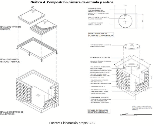 Cámara de entrada: Elemento de la infraestructura soporte de la red interna de telecomunicaciones del inmueble. Compartimiento, habitáculo o recinto subterráneo de la infraestructura que soporta la red interna de telecomunicaciones del inmueble, ubicado en la zona exterior del mismo y a la que confluye la canalización externa de la infraestructura del inmueble que soporta la red de telecomunicaciones de este. La cámara de entrada permite, a través de la canalización externa del inmueble, el acceso de los cables de las redes de alimentación de los diferentes proveedores de servicios al salón de equipos de telecomunicaciones para establecer su conexión con la red interna de telecomunicaciones del inmueble. Su diseño y construcción es responsabilidad del constructor del inmueble.