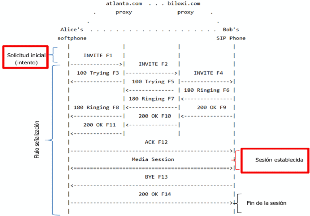 6. La imagen muestra un ejemplo típico de un intercambio de mensajes de señalización mediante el protocolo SIP entre dos (2) usuarios Alice y Bob, cada mensaje se encuentra enumerado y etiquetado con la letra F.