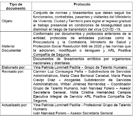 Consecuencia de lo anterior, el Ministerio de Vivienda, Ciudad y Territorio adoptó un Protocolo de Bioseguridad que cuenta con el aval de la ARL Positiva y procedió con su cargue en la página que la autoridad local dispuso para tal fin, además lo adoptó a través de la Resolución número 312 de 2020, el citado protocolo ha sido objeto de tres actualizaciones, la última adoptada mediante la Resolución número 507 de 2020; las cuales también se han cargado en la página que dispuso la autoridad local y cuentan con el aval de la ARL Positiva.