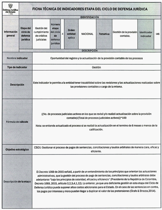 6. Los veinticuatro (24) indicadores de esta medición se distribuyen también en las distintas etapas del Ciclo de Defensa Jurídica del Estado, así: (i) tres (03) indicadores en la etapa de gestión del conocimiento, (ii) cuatro (04) en prevención del daño antijurídico, (iii) cuatro (04) en gestión extrajudicial, (iv) siete (07) en gestión de la defensa judicial, (v) cuatro (04) en gestión del cumplimiento de créditos judiciales y (vi) dos (02) en gestión de los mecanismos para la protección y recuperación del patrimonio público.