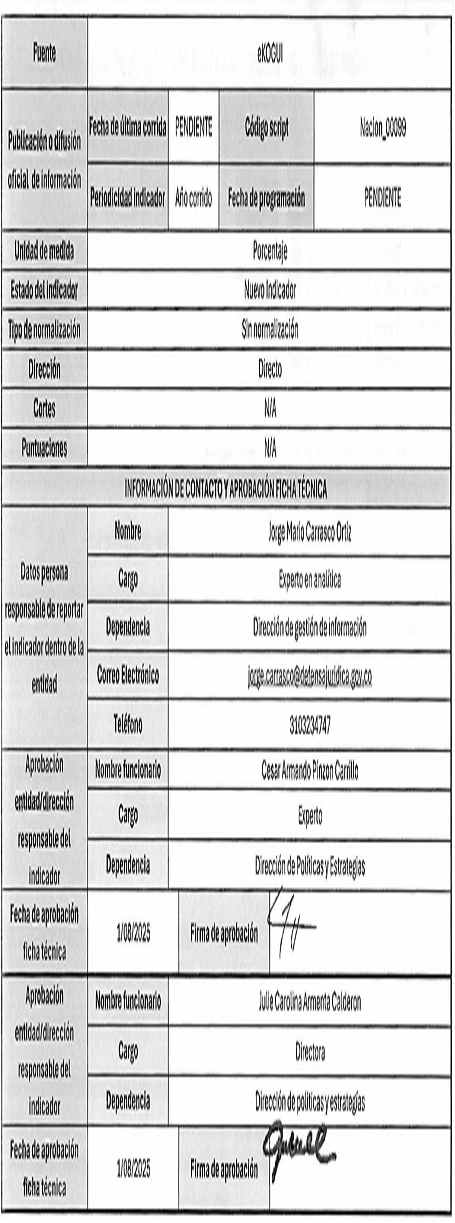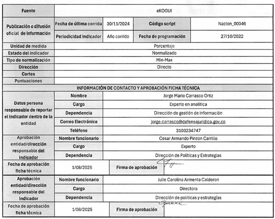 7. La ficha técnica de cada indicador detalla: (i) tipo de indicador, (ii) objetivo estratégico, (iii) descripción de la etapa, (iv) fuente, (v) unidad de medida, (vi) estado del indicador, (vii) tipo de normalización, (viii) dirección, (ix) cortes, (x) fórmula de cálculo, entre otros.