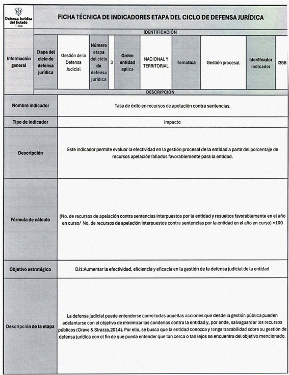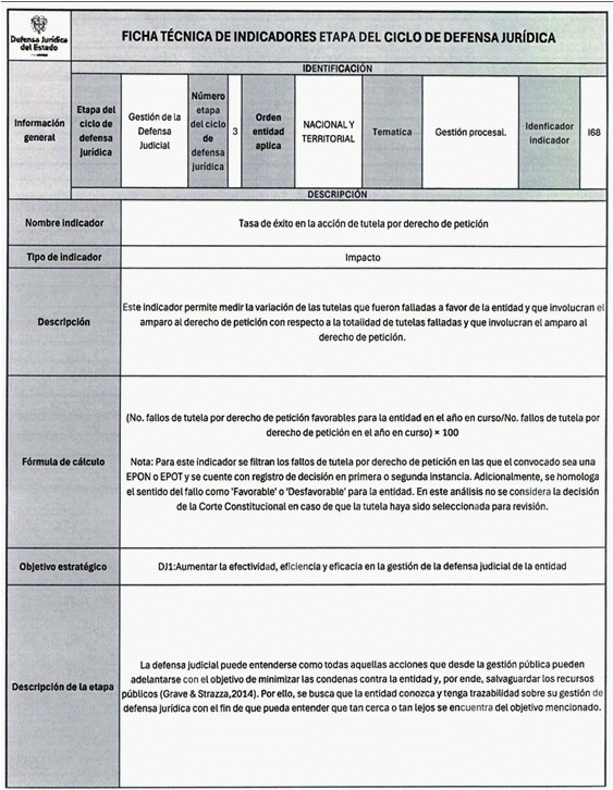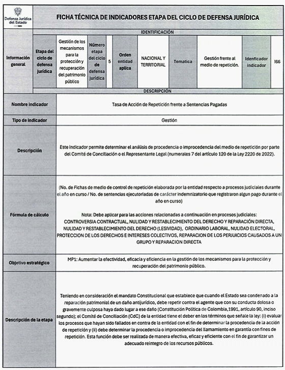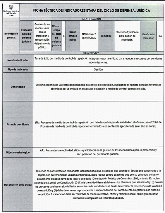 Los indicadores de gestión son aquellos que evalúan el avance en el desarrollo de un proceso específico, los de resultado miden el cumplimiento de un objetivo y los de impacto que valoran los efectos de una estrategia, intervención o programa en el Ciclo de Defensa Jurídica del Estado.