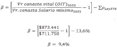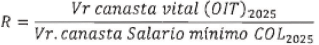 Paso 2. Cálculo del valor de la canasta según el salario mínimo mensual 2025, aplicando la fórmula de salario vital. El salario vital para el salario mínimo se calcula con la siguiente ecuación: