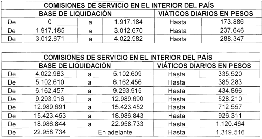 ARTÍCULO 4o. VALOR DE VIÁTICOS. En la Rama Judicial, el Ministerio Público y la Fiscalía General de la Nación, el valor de los viáticos dentro del territorio nacional será establecido de acuerdo con la distancia, medios de transporte y condiciones de la vía, posibilidades hoteleras, costos del sitio de cumplimiento de la comisión y demás factores relacionados con la labor que cumplir por los funcionarios y empleados, el cual se reconocerá desde un mínimo de treinta y nueve mil setecientos setenta y un pesos ($39.771) moneda corriente, hasta por las cantidades señaladas en cada caso.
