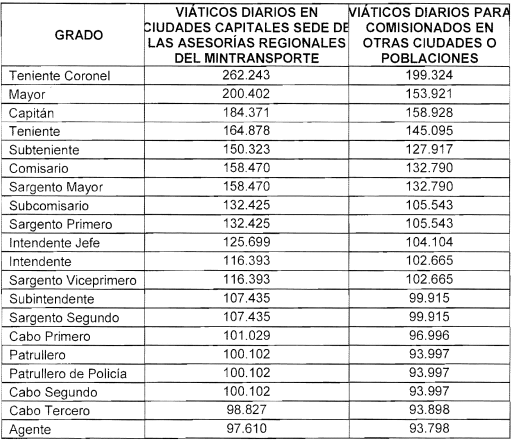 ARTÍCULO 9o. ESCALA DE VIÁTICOS. A partir de la vigencia del presente decreto, fíjese la siguiente escala de viáticos para el personal de la Policía Nacional destinado para prestar sus servicios como Policía de Tránsito y Transporte adscrita al Ministerio de Transporte que deba cumplir comisión en el territorio nacional así:
