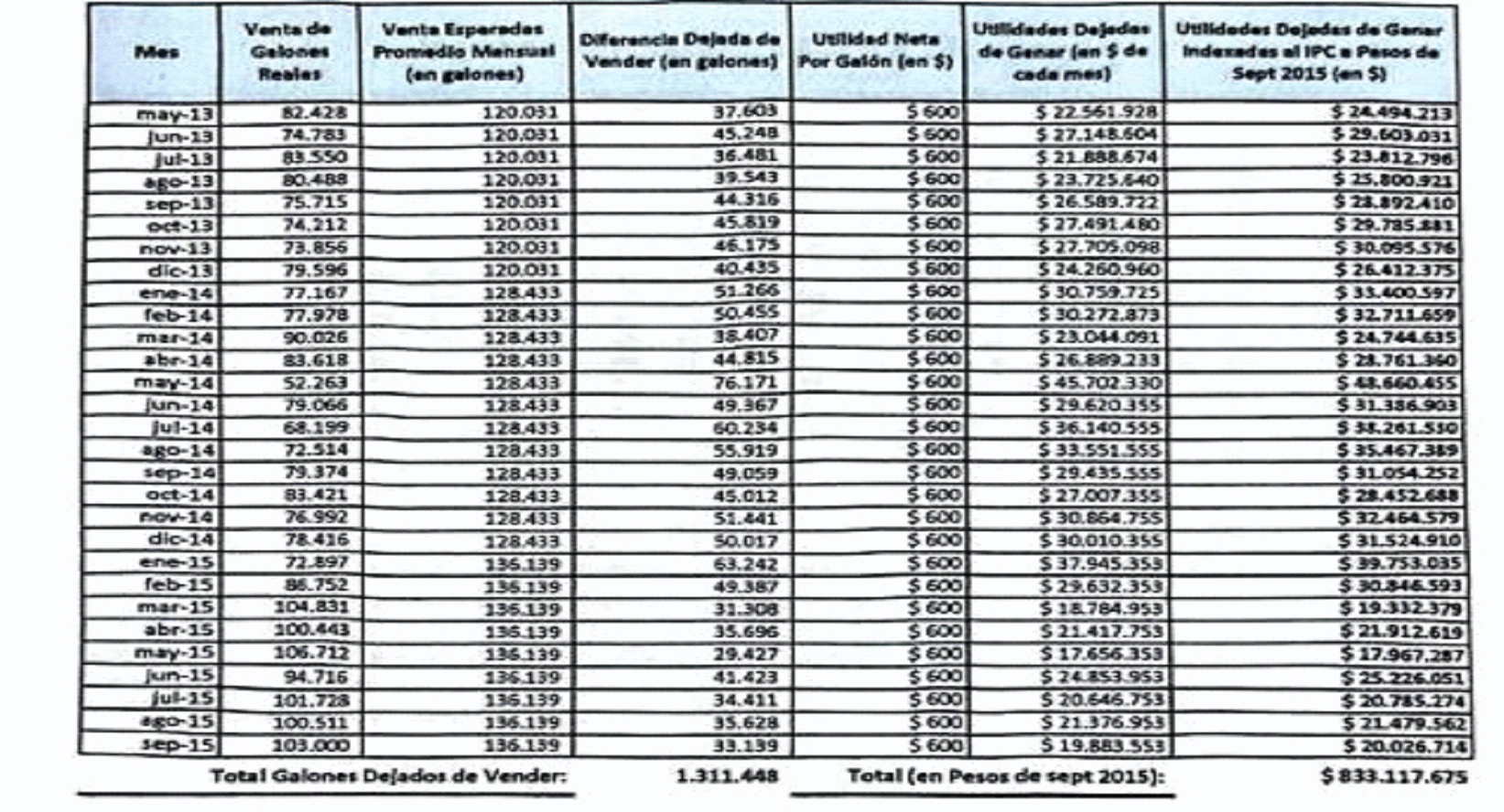 $833'117.675 por las pérdidas en la venta de gasolina y “utilidades dejadas de percibir”, “lo anterior con fundamento en la disminución en ventas registradas en promedio mensual por valor de $663'000.000”.