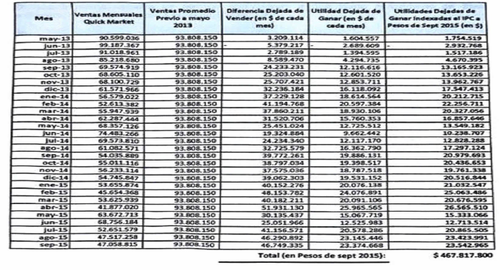 $467'817.800 por la disminución de las ventas del Quick Market, que registraron una caída de “$45'000.000”, pues, en el mes anterior a la ejecución de las obras, se registraron ventas por un valor de $101'000.000 y con la realización de éstas descendieron a $53'000.000.