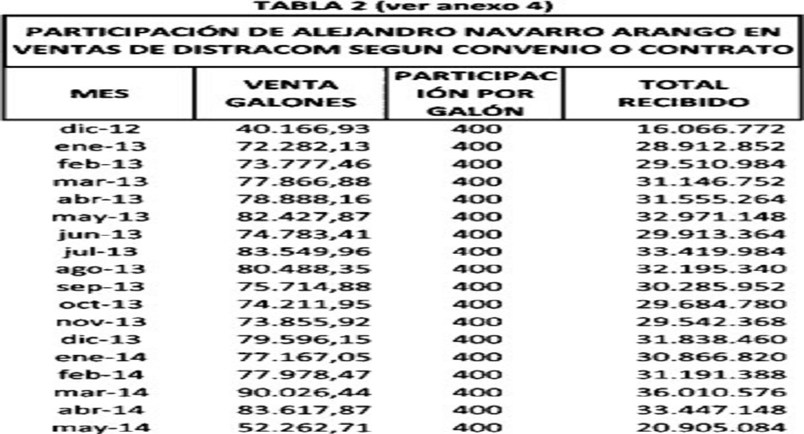 78. Adicionalmente, el experto tasó la utilidad neta por galón de gasolina en $600, dato sobre el que la sala tiene información diversa que impide conferirle el grado de certeza que se necesita, pues según se ha referenciado, distintos medios de prueba acreditan que el margen era de $400 desde el 19 de diciembre de 2012, debido al negocio que había celebrado la Corporación Navarro Cía. S.A.S. con Distracom S.A., el cual afirmó conocer para el momento en que elaboró el informe –ver párrafo 49 de esta providencia–.