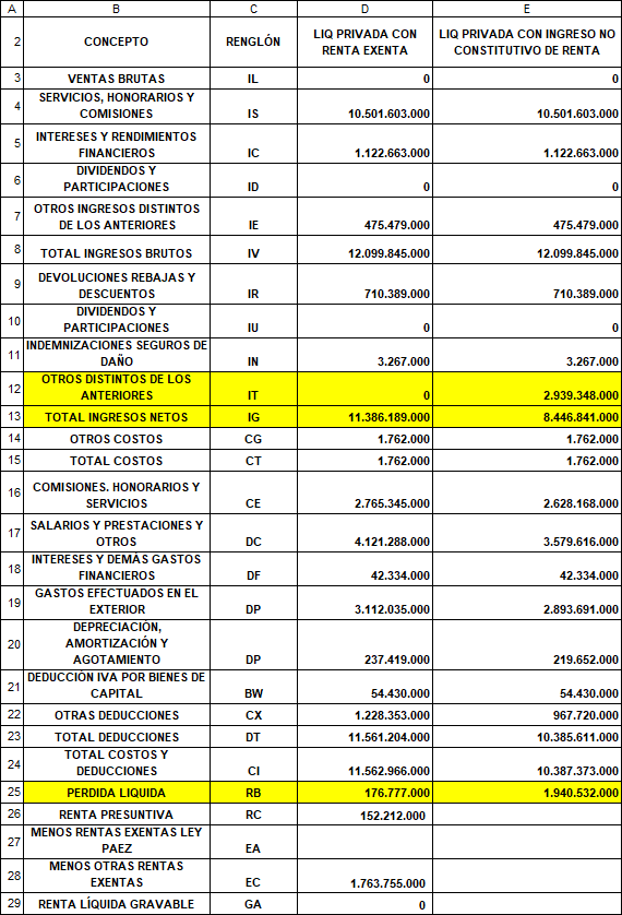 Como se puede apreciar, conforme con la liquidación privada que figura en la columna D, la parte actora integró las rentas de fuente nacional y las rentas de fuente extranjera, incluidas en éste último ítem, las rentas que obtuvo en Venezuela. Por eso, la operación aritmética le arrojó una pérdida líquida de $176.777.000. En cambio, en la liquidación de la columna E, si la parte actora hubiera tratado las rentas que obtuvo en Venezuela como ingresos no constitutivos de renta y hubiera restado los costos y deducciones asociados a esa renta, la liquidación le habría arrojado una pérdida líquida de $1.940.532.000.