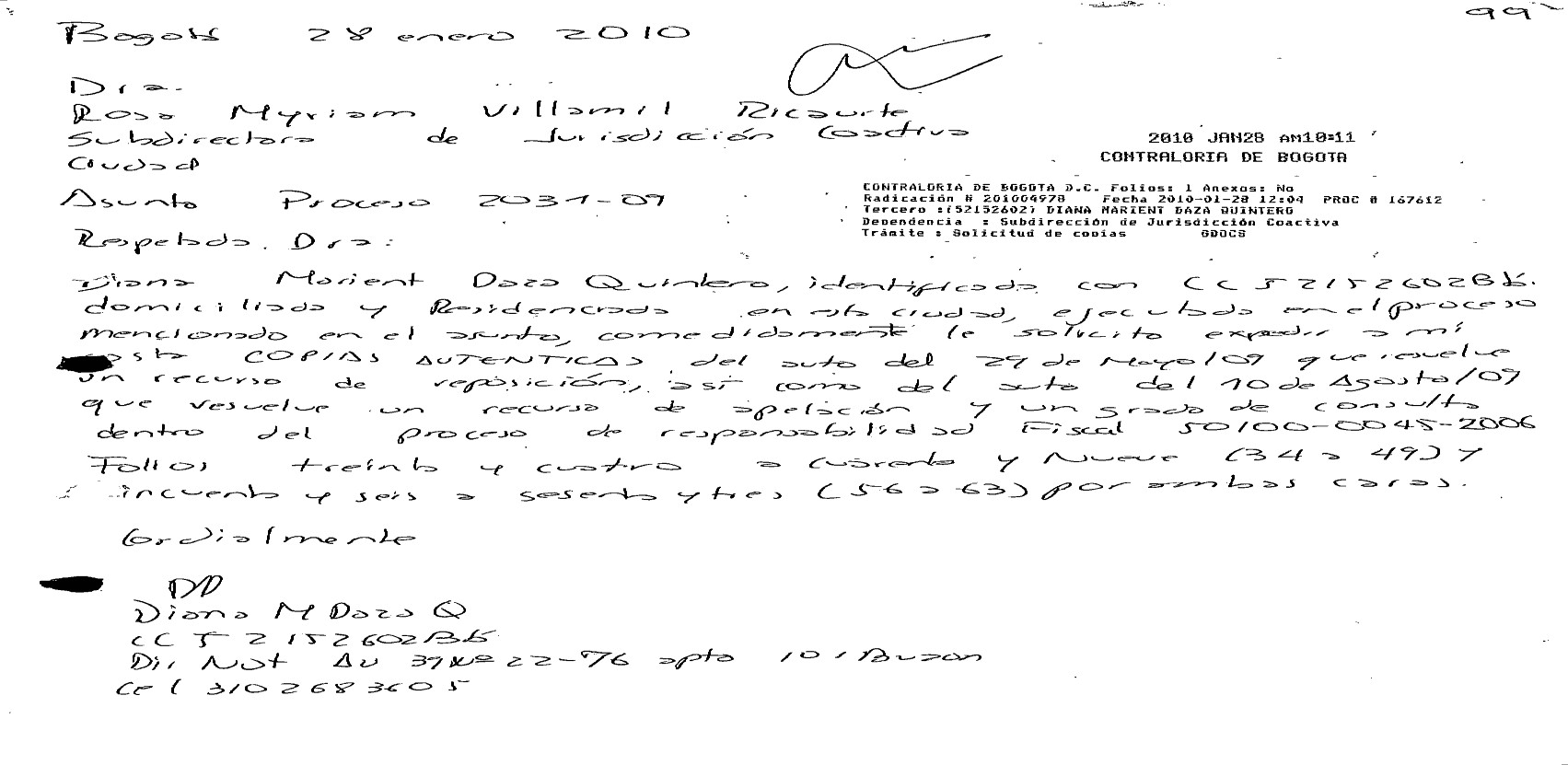 Indebida notificación del mandamiento de pago. La Contraloría Distrital de Bogotá al resolver los recursos, excepciones y nulidades propuestos en el trámite de cobro coactivo ha sostenido que el mandamiento de pago se notificó el 28 de enero de 2010 por conducta concluyente, al tener en cuenta la anotación a mano que aparece en la solicitud de copias auténticas de los autos que resolvieron los recursos de reposición y de apelación interpuestos contra el fallo con responsabilidad fiscal. En el anverso de dicho escrito consta que: «[...] 28 enero de 2010 El Despacho deja Constancia que el mandamiento de pago del 24-12/2009, quedó notificado por conducta concluyente, habida cuenta que la ejecutada, Diana Marient Daza Quintero con cédula de ciudadanía No. [...] allegó al Despacho la rad. No. 2010049 del 28-01/10, peticionando la expedición de copias dentro del proceso de Jurisdicción Coactiva No. 2031" anotación que aparece firmada por el señor HÉCTOR ALEJANDRO PELÁEZ FERNÁNDEZ»18.
