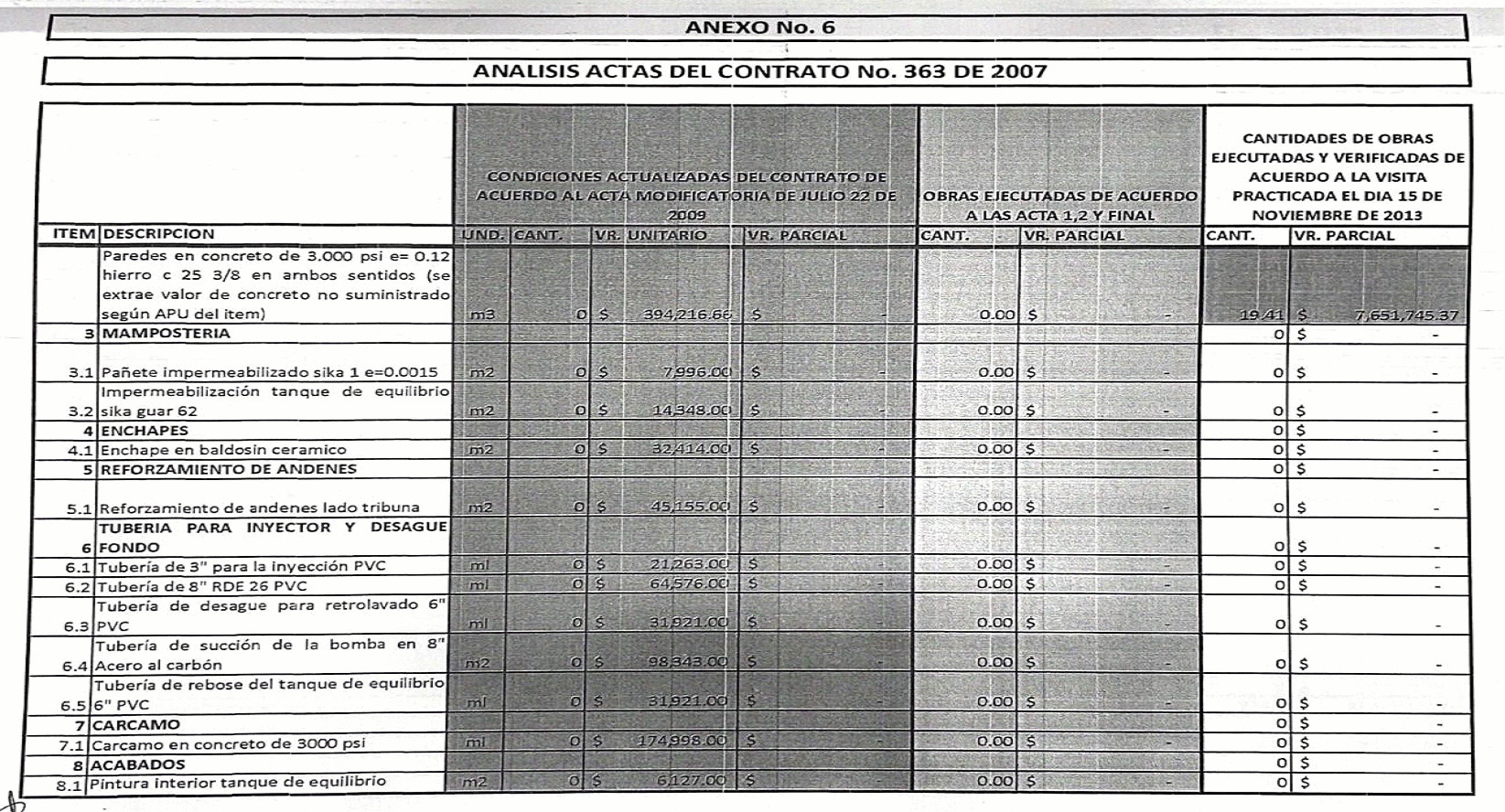 Precisó que la no continuación de la ejecución de las obras en la piscina olímpica ocurrió en la administración del señor Omar Diazgranados quien no contrató los estudios a pesar de su recomendación. Sostuvo que en la visita de inspección del año 2013 se revisó ítem por ítem lo ejecutado, no se efectuó ninguna medición y que el acero se puede recuperar.
