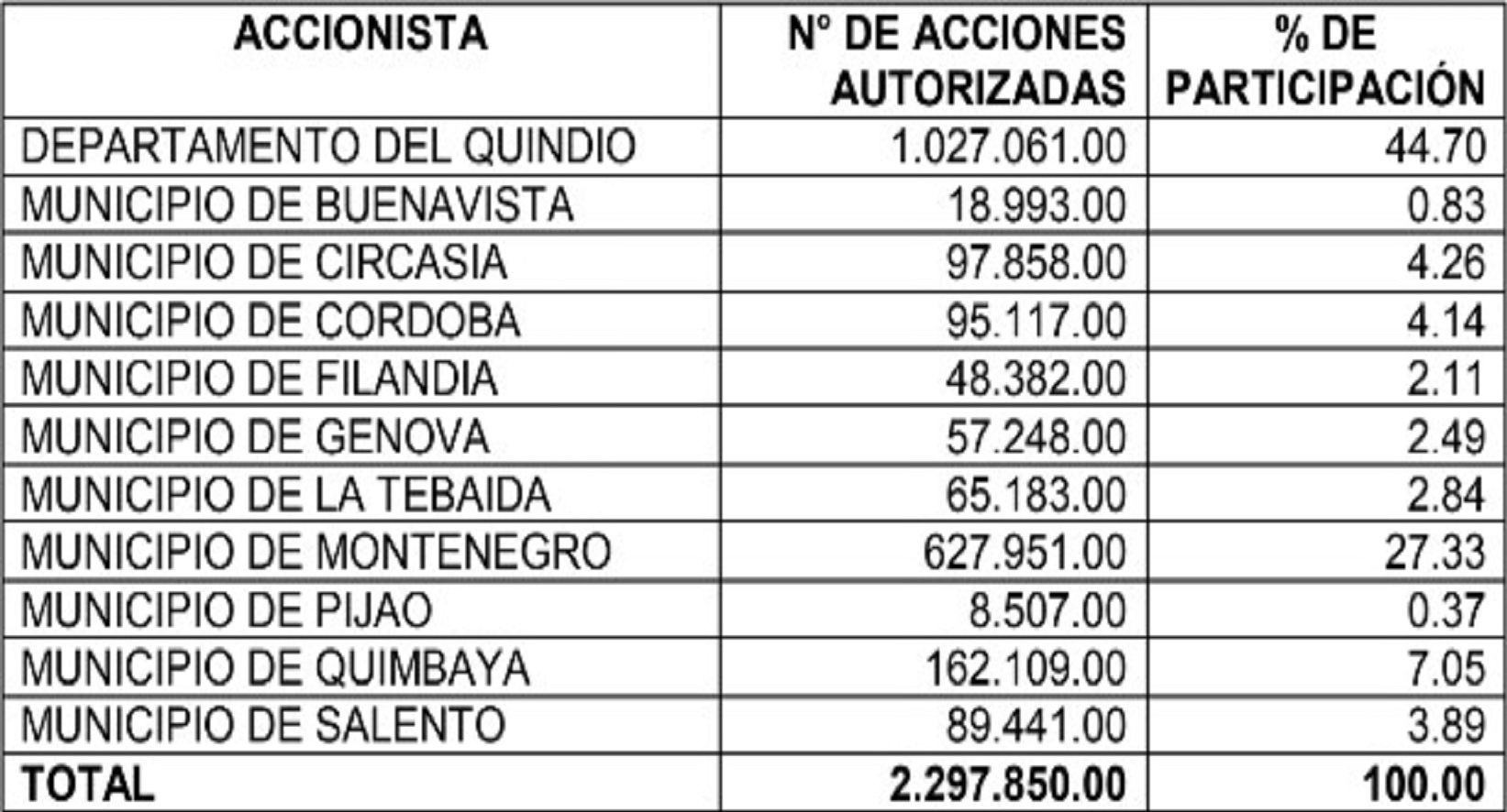 Advirtió que el hecho de que no se encuentre regulada la asamblea general de alcaldes «no constituye un impase menor», toda vez que, según el porcentaje de participación, el accionista principal es el departamento del Quindío, el cual, a pesar de que forma parte de la junta directiva junto con los alcaldes de Circasia, Montenegro y Quimbaya, fue excluido de intervención alguna en la elección de la terna de la que se eligió al gerente general.