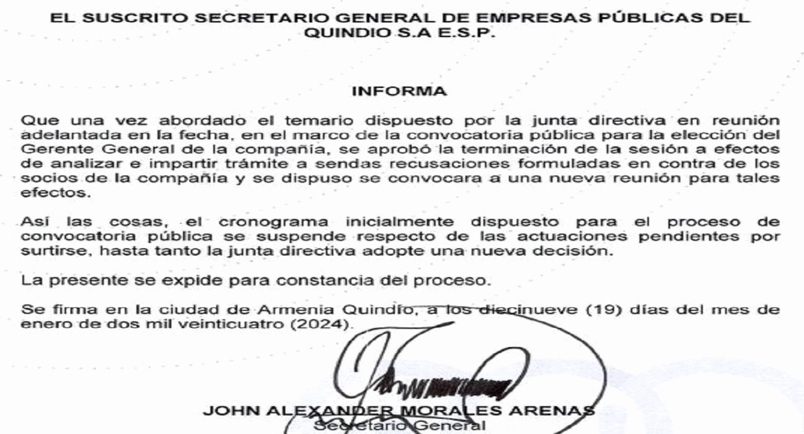 Indicaron que, mediante Acuerdo 001 del 7 de febrero de 2024, expedido por la junta directiva de EPQ SA ESP, fue elegido José Alejandro Guevara como gerente de la empresa, para un periodo personal de cuatro años, a partir de su inscripción en el registro mercantil de la Cámara de Comercio correspondiente.
