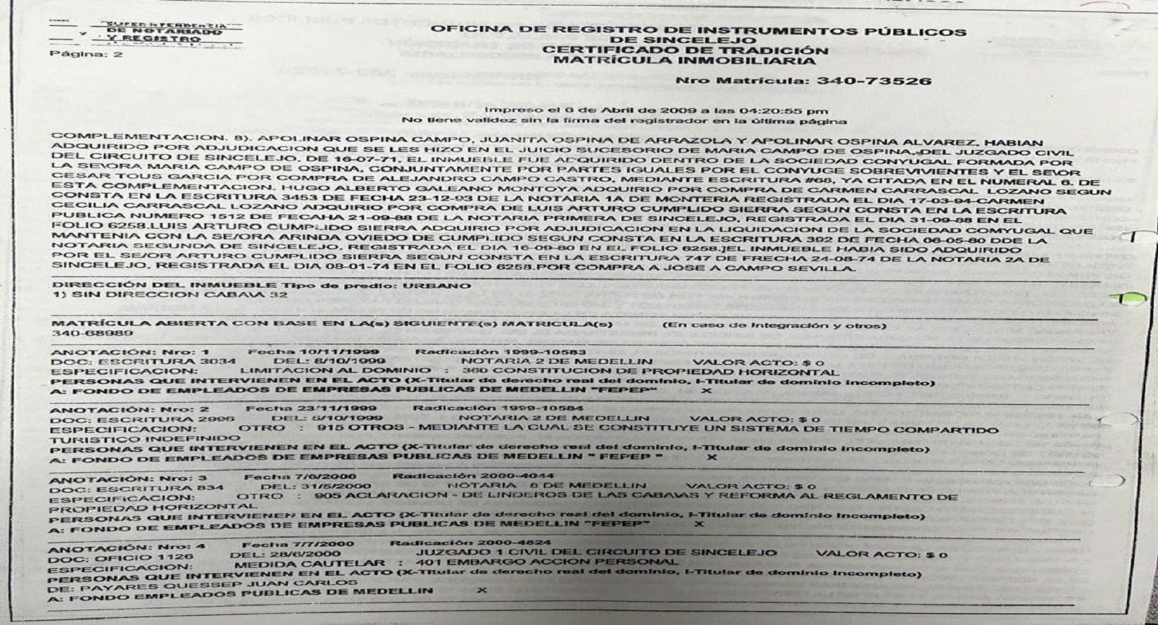 - Advirtió que en el expediente se encuentra el certificado de tradición y libertad expedido por la Oficina de Registro de Instrumentos Públicos de Sincelejo, esto es, respecto del bien inmueble identificado con la matrícula inmobiliaria 340-73526, en cuya anotación 1ª de 10 de noviembre de 1999 se registró la constitución del régimen de propiedad horizontal conforme a la escritura pública 3034 del 8 de octubre de 1999 de la Notaría 2ª del Círculo de Medellín.