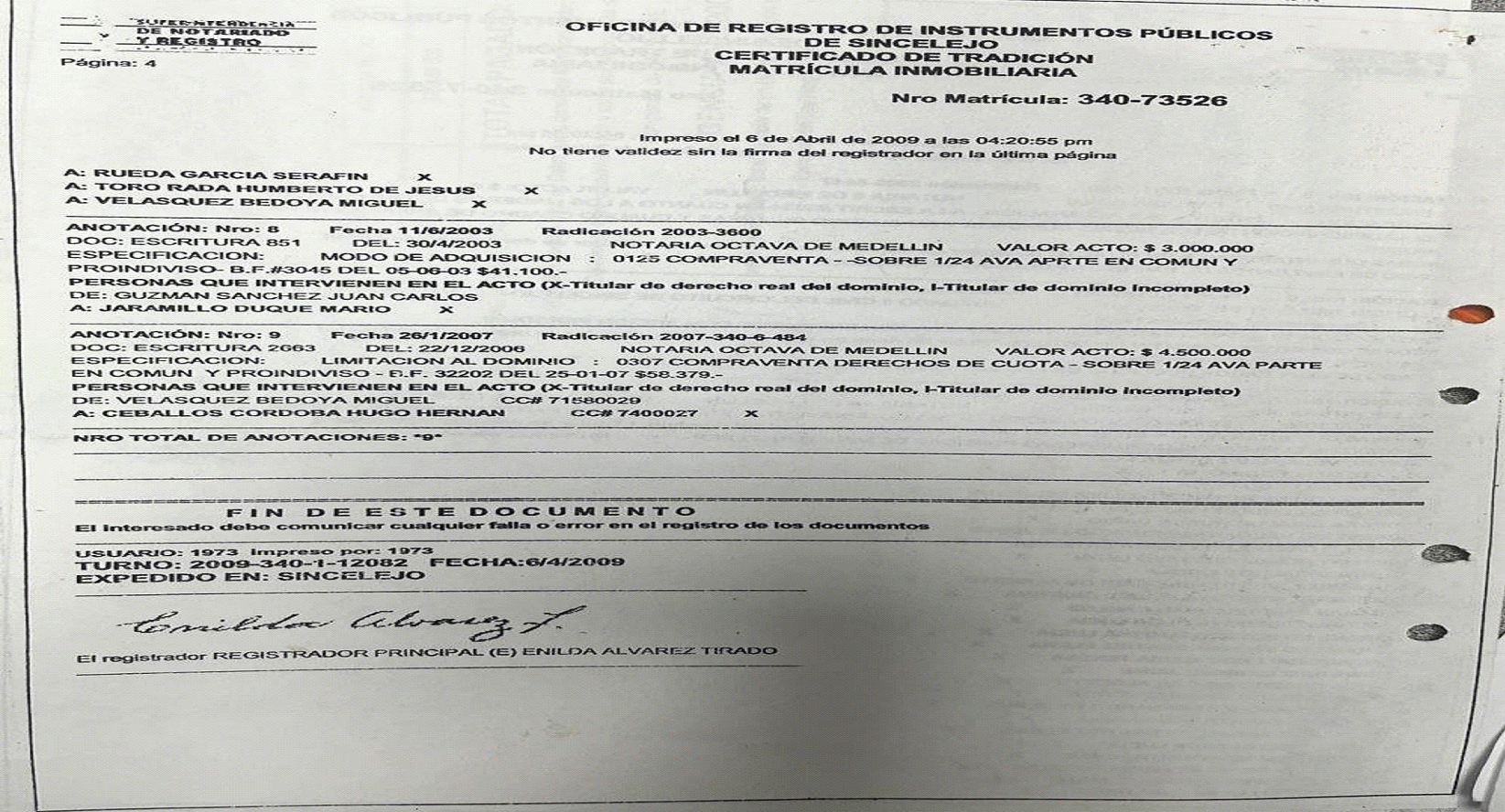 - De la lectura del certificado de tradición y libertad respecto del inmueble identificado con la matrícula inmobiliaria No. 340-73526, ubicado en Santiago de Tolú, Sucre, bajo la jurisdicción del Círculo Registral de Sincelejo, la Sala encuentra que el mismo ha estado sujeto a diversas operaciones jurídicas desde su apertura el 23 de noviembre de 1999, entre las cuales se observa la constitución de la propiedad horizontal del condominio, la creación del sistema de tiempo compartido, compraventas de partes indivisas y limitaciones de dominio.