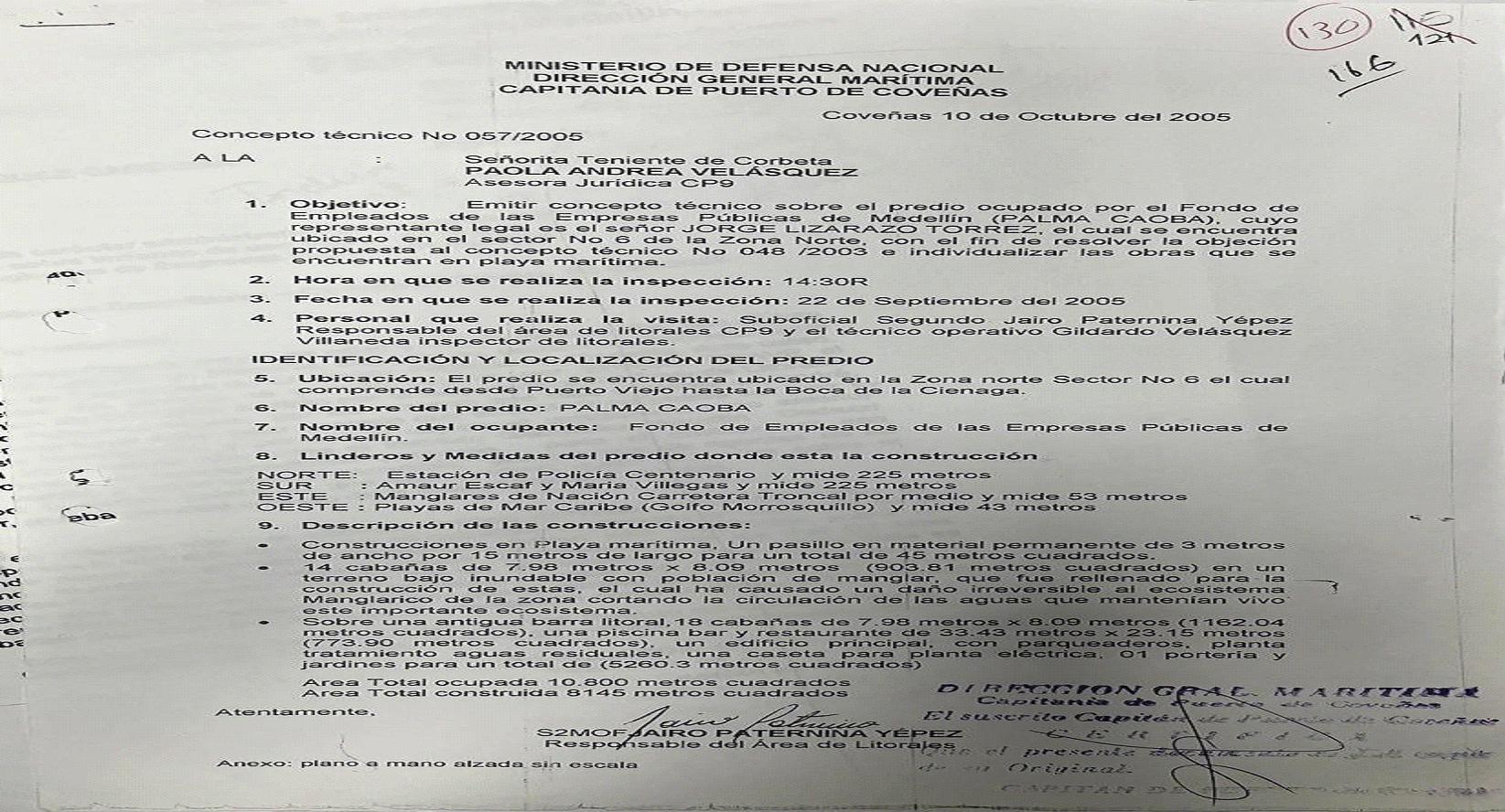 - Manifestó que luego de realizar una inspección del lugar donde se adelantaba la investigación administrativa, esto es, en la zona Norte, sector 6 (La Martha) del municipio de Coveñas, y luego de describir las construcciones levantadas por el Fondo de Empleados de Empresas Públicas de Medellín, se elaboró el concepto técnico 10 de 22 de junio de 2006, el cual concluyó que en el predio objeto de la actuación administrativa se presentan características de playa marítima, de acuerdo con los parámetros establecidos en el artículo 167 del Decreto Ley 2324 de 1984.