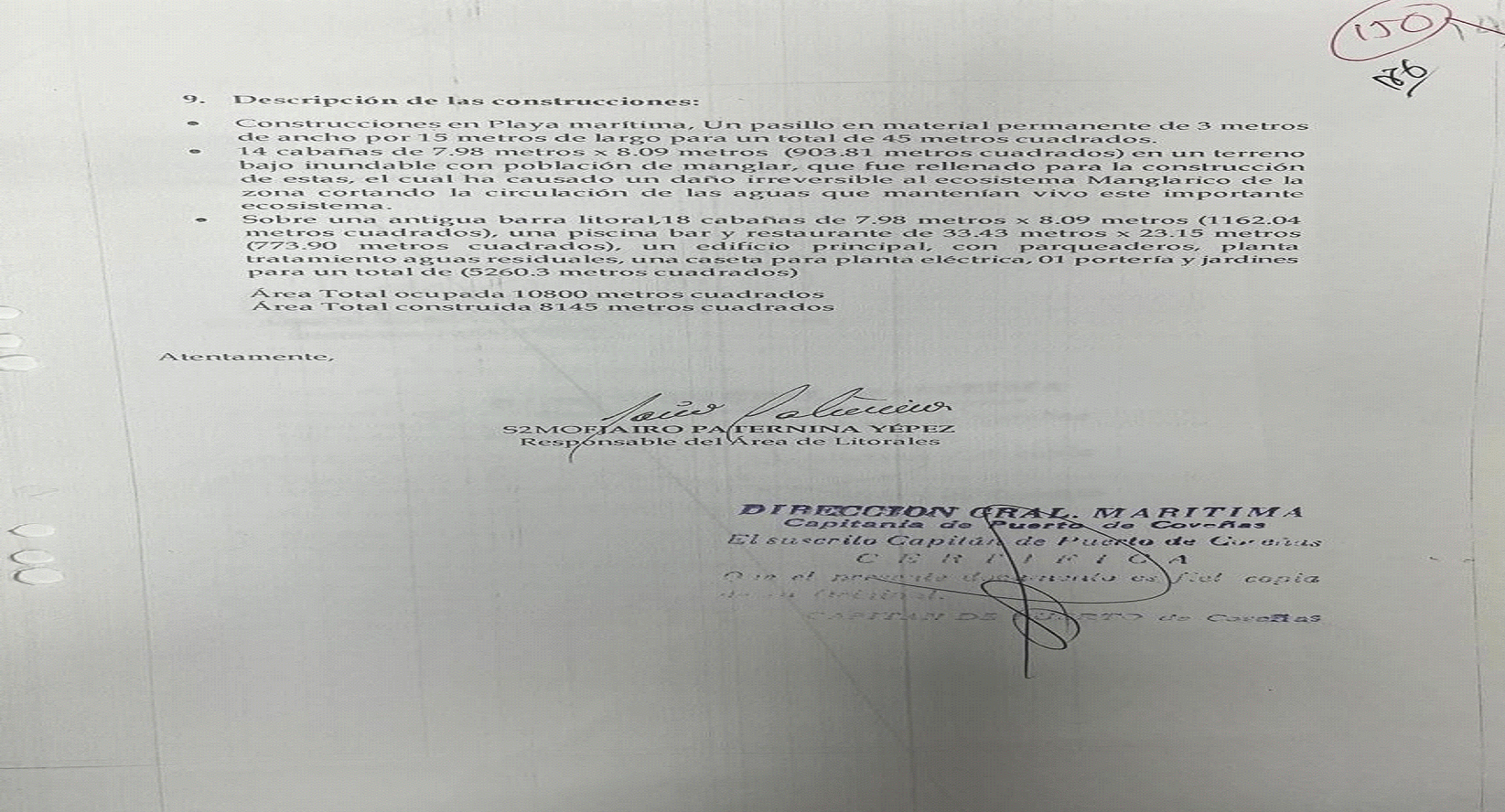 - Argumentó que a pesar del conocimiento que tenía el mencionado representante legal de la apertura de la investigación, continuó con la construcción del condominio y siguió con los trámites de constitución de propiedad horizontal, razón por la cual fue declarado responsable administrativamente por la autoridad marítima mediante la Resolución 134 del 31 de octubre de 2006, expedida por la Capitanía de Puerto de Coveñas, confirmada mediante acto administrativo sin número de 23 de enero de 2009, expedida por el Director General Marítimo de la DIMAR.