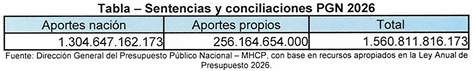 Que para la vigencia fiscal de 2026 se ha presupuestado en los rubros de créditos judicialmente reconocidos, para cada una de las Secciones Presupuestales, la suma de $1,5 billones (Aportes Nación $1,354 Billones y Recursos Propios $256 mil millones).