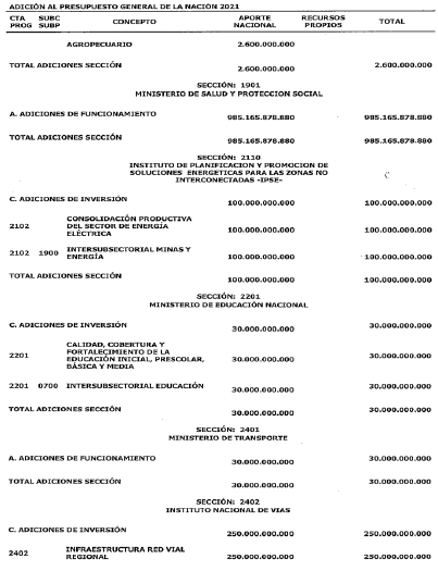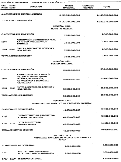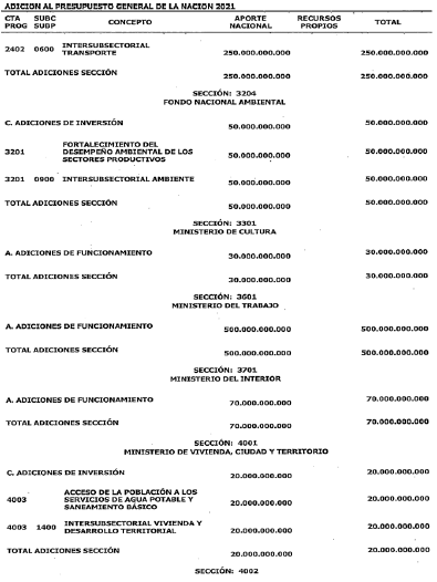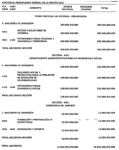 ARTÍCULO 63. ADICIÓN AL PRESUPUESTO DE GASTOS O LEY DE APROPIACIONES. Adiciónese el Presupuesto de Gastos o Ley de Apropiaciones del Presupuesto General de la Nación de la vigencia fiscal de 2021 en la suma de diez billones novecientos cincuenta y cuatro mil trescientos sesenta y cinco millones ochocientos setenta y ocho mil ochocientos ochenta pesos ($10.954.365.878.880) moneda legal, según el siguiente detalle: