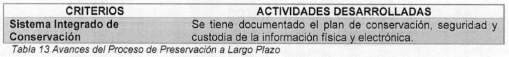 | Tabla 13 Avances del Proceso de Preservación a Largo Plazo ................................... | 20 |