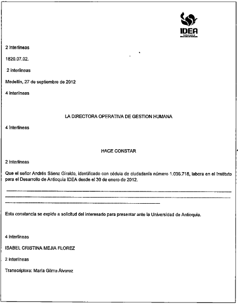 Andrés Sáenz Giraldo, Técnico Operativo Administración Documental