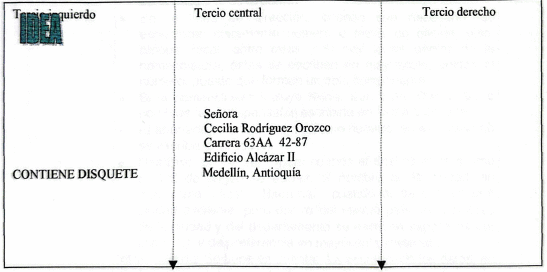 | Tercio izquierdo | Se emplea para anotaciones tales como: CONFIDENCIAL, PERSONAL, CONTIENE DISQUETE, CONTIENE VIDEOCINTA, CONTIENE CINTA MAGNETICA, CONTIENE MUESTRA, entre otras, las cuales se ubican centradas en la parte inferior del tercio. |