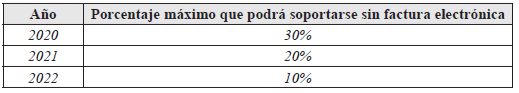 PARÁGRAFO TRANSITORIO 1o. Los requisitos, condiciones y procedimientos establecidos en el presente artículo, serán reglamentados por el Gobierno nacional; entre tanto aplicarán las disposiciones que regulan la materia antes de la entrada en vigencia de la presente ley. Las facturas expedidas de conformidad con los artículos 1.6.1.4.1.1 al 1.6.1.4.1.21. del Decreto número 1625 de 2016 mantienen su condición de documentos equivalentes. A partir del 1 de enero de 2020, se requerirá factura electrónica para la procedencia de impuestos descontables, y costos o gastos deducibles, de conformidad con la siguiente tabla: