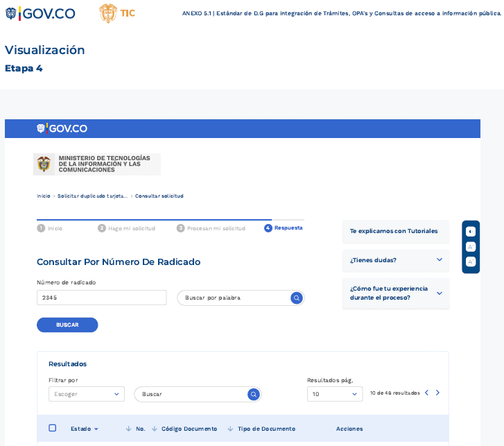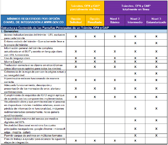 Una vez la autoridad culmine el proceso de adecuación de los trámites, OPAs, consulta de acceso a información pública y haya solicitado la integración al Portal Único del Estado Colombiano - WWW.GOV.CO,el Ministerio de las Tecnologías de Información y las Comunicaciones (MinTIC) verificará el cumplimiento de los requisitos, definidos en la presente estándar y sus anexos.