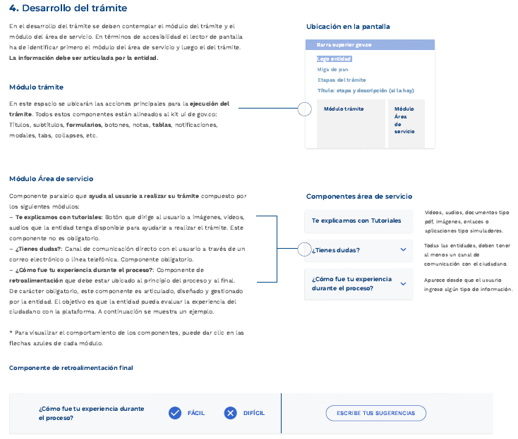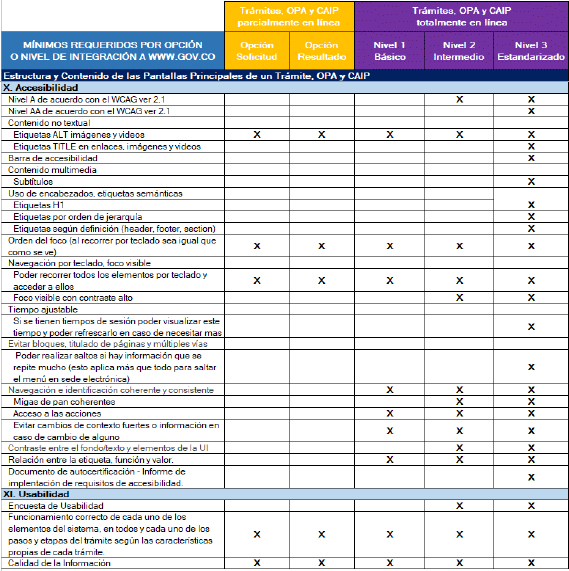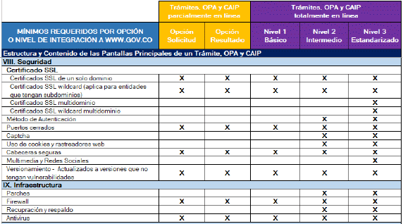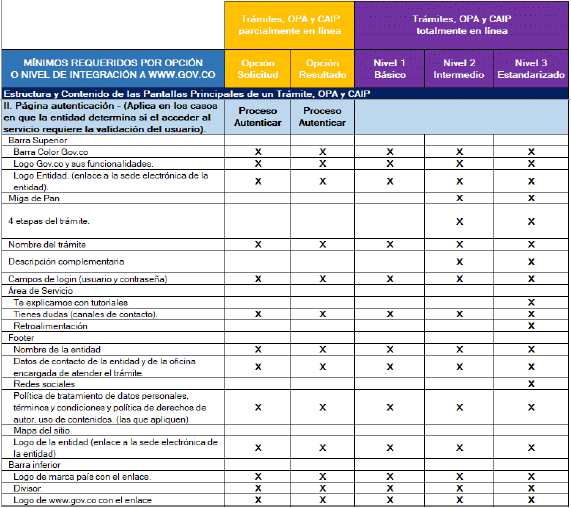 | - Generación de los desarrollos requeridos en el acondicionamiento o trasformación del trámite garantizando el uso de los recursos y los servicios ciudadanos digitales disponibles, evitando duplicar esfuerzos al implementar funcionalidades que hayan sido habilitadas como parte de estos. - Implementación de los elementos de diseño de la línea gráfica definidos por MinTic, considerando los elementos de estilo, usabilidad y arquitectura de información que permitirán la homologación de la interfaz de usuario asegurando una experiencia de usuario agradable. Aplicación de los requsitos definidos en ese estándar y sus anexos. - Implementar en el trámite, OPA o consulta de acceso a información pública a integrar, los mecanismos necesarios para habilitar el single sing on/out con WWW.GOV.CO, para los que requieran autenticación. - Como parte de las funcionalidades del trámite, OPA o consulta de acceso a información pública que se habiliten por medios digitales, la autoridad debe implementar un servicio que le permita a los usuarios realizar seguimiento del estado y avance del proceso solicitado, aplica para aquellos cuya respuesta no es inmediata a la solicitud. Se debe tener en cuenta la equivalencia de las 4 etapas. - Aseguramiento de la calidad de la información y la disponibilidad de los servicios digitales implementados. - Implementación de los controles de seguridad informática definidos en este estándar y sus anexos. - Coordinar y retroalimentar a MinTIC, a través de los mecanismos habilitados, respecto al avance del proceso de acondicionamiento y transformación de trámites, OPAs y consulta de acceso a información pública para su integración a WWW.GOV.CO. - Para los casos en que la página o URL cambie o sea retirada de operación se debe coordinar lo necesario para actualizar oportunamente en SUIT y en WWW.GOV.CO. | - Habilitar los mecanismos técnicos necesarios para integrar en WWW.GOV.CO los desarrollos y servicios digitales entregados por la entidad que cumplan con los requisitos establecidos. - Gestión de la redirección del trámite desde WWW.GOV.CO hasta la aplicación donde se desarrolla el trámite, OPA o consulta de acceso a información pública habilitado por la autoridad. - Implementar en WWW.GOV.CO los mecanismos necesarios para habilitar el single sign on/out con los trámites que requieran autenticación. |