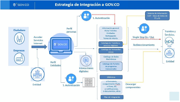 Esta alternativa de integración evolucionó y pasa a conformar el esquema único de integración de trámites, OPAs y consulta de acceso a información pública al Portal Único del Estado Colombiano - WWW.GOV.CO, para lo cual la autoridad debe dar cumplimiento a lo requerido en aspectos de diseño gráfico, de seguridad y técnicos, indicados por MinTIC, para acceder desde WWW.GOV.CO a través del mecanismo de redireccionamiento.
