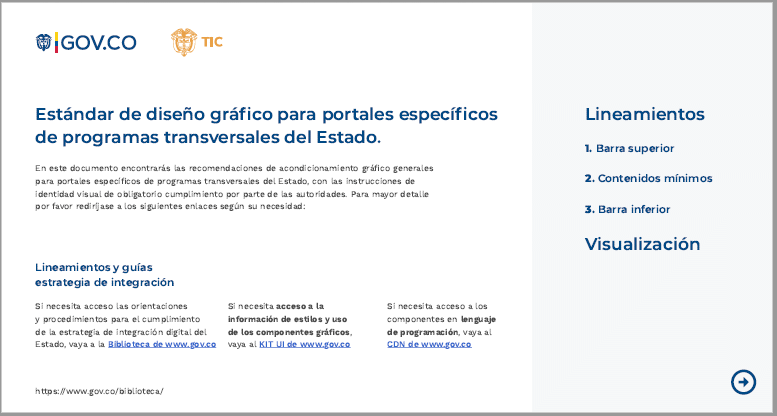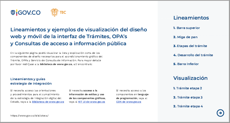 Para agilizar la unificación de contenidos gráficos en Portal Único del Estado colombiano - WWW.GOV.CO, se ha implementado un Repositorio de Archivos Estáticos parala línea gráfica (Content Delivery Network - CDN) con los elementos de diseño que pueden ser usados para adecuar los trámites. En esta herramienta podrán encontrar elementos como iconos, botones, fuentes y demás recursos gráficos a ser implementados. Estos elementos están disponibles en la biblioteca de WWW.GOV.CO (https://www.gov.co/biblioteca/ yen https://cdn.www.gov.co/v4/ o la última versión disponible.