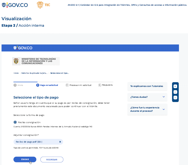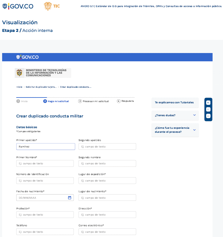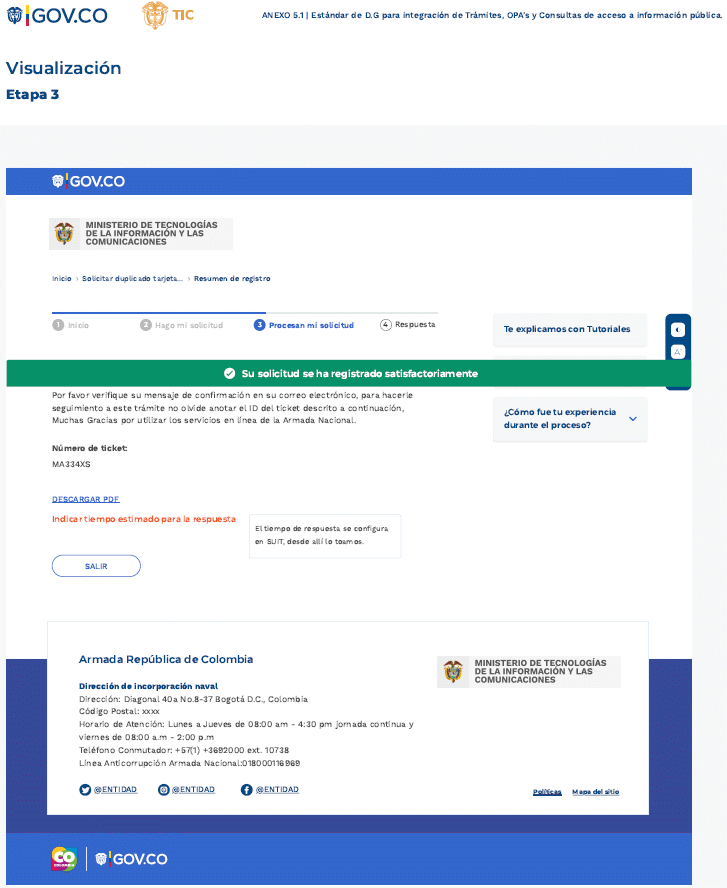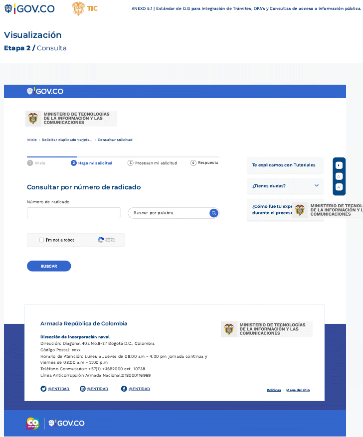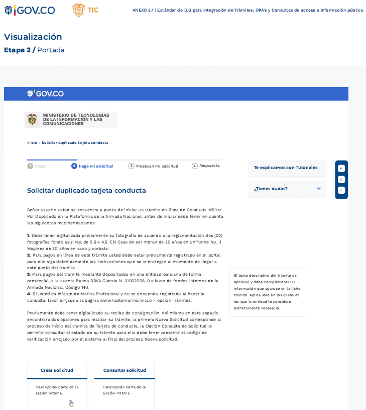 Una vez la autoridad haya asegurado la calidad de la información general que se presenta en la ficha informativa, transformado o acondicionado el trámite, OPA o consulta de acceso a información pública, debe solicitar formalmente la integración a WWW.GOV.COWWW.GOV.CO atendiendo los procedimientos establecidos por MinTIC, diligenciando el formulario de solicitud de integración al Portal Único del Estado Colombiano - WWW.GOV.CO, confirmando que cumple con los parámetros que se han dispuesto en la presente estándar y que tienen por objeto apoyar a las autoridades en el camino hacia la transformación digital.
