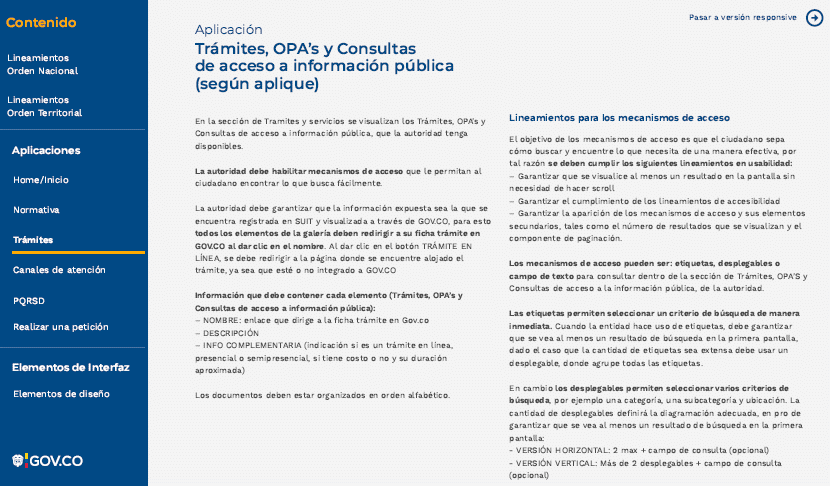 Durante el proceso de acondicionamiento y transformación de los trámites, las autoridades deben generar las acciones necesarias para cumplir con los lineamientos de diseño gráfico requeridos, teniendo en cuenta lo definido en la directiva presidencial 03 de 2019 (cuando aplique) y el Anexo 5.1 Estándar de Diseño Gráfico Para Integración de Trámites, OPA's y consulta de acceso a información pública a WWW.GOV.CO.