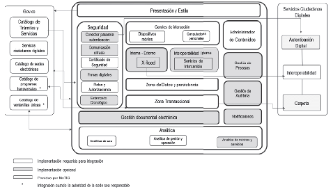 Este esquema de integración no se continuará implementado, sin embargo, para los trámites, OPAs y consulta de acceso a información pública que a la fecha de publicación de este estándar estén integrados o en proceso adelantado de integración al Portal Único del Estado en esta alternativa, continúan en operación y/o se completará el proceso de integración a WWW.GOV.CO asegurando se cumpla con lo establecido en la guía de integración de trámites versión 1.0 que se refería a este esquema de integración. De esta manera se genera valor a los usuarios y se explota el esfuerzo conjunto realizado, los cuales adicionalmente podrán ser de gran utilidad al momento de aplicar para servicios ciudadanos digitales de interoperabilidad y de carpeta ciudadana.