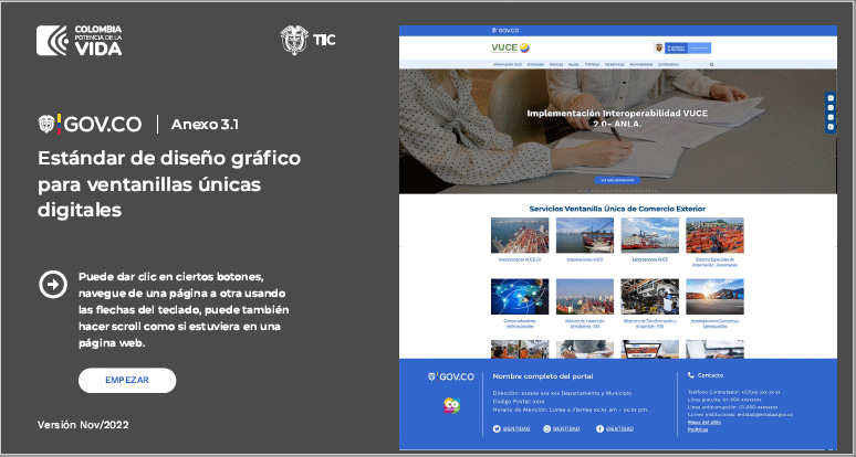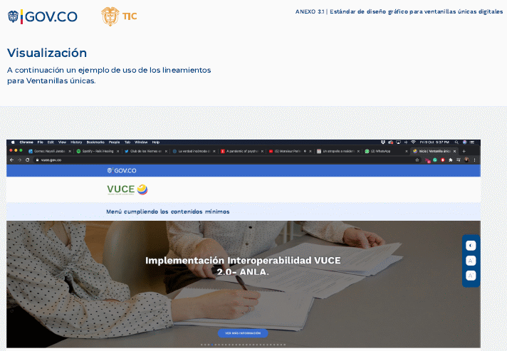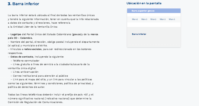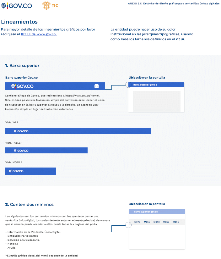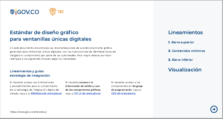 ARTÍCULO 5o. GUÍA TÉCNICA DE INTEGRACIÓN DE VENTANILLAS ÚNICAS AL PORTAL ÚNICO DEL ESTADO COLOMBIANO - GOV.CO Y GUÍA DE DISEÑO GRÁFICO PARA VENTANILLAS ÚNICAS. Los sujetos obligados deberán adoptar la guía técnica de integración de ventanillas únicas al Portal Único del Estado colombiano - GOV.CO señalada en el anexo 3 y la Guía de diseño gráfico para ventanillas únicas señalada en el anexo 3.1 de la presente resolución.