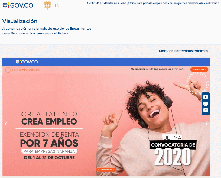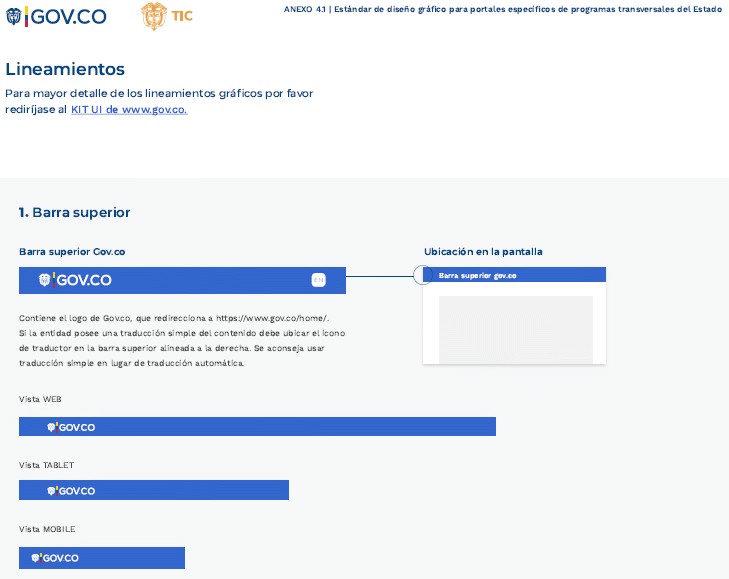 ARTÍCULO 6o. GUÍA TÉCNICA DE INTEGRACIÓN DE PORTALES ESPECÍFICOS DE PROGRAMAS TRANSVERSALES DEL ESTADO AL PORTAL ÚNICO DEL ESTADO COLOMBIANO - GOV.CO Y GUÍA DE DISEÑO GRÁFICO PARA PORTALES ESPECÍFICOS DE PROGRAMAS TRANSVERSALES DEL ESTADO. Los sujetos obligados deberán adoptar la guía técnica de integración de portales específicos de programas transversales del Estado al Portal Único del Estado colombiano - GOV.CO señalada en el anexo 4 de la presente resolución y la Guía de diseño gráfico para portales específicos de programas transversales del Estado señalada en el anexo 4.1 de la presente resolución.