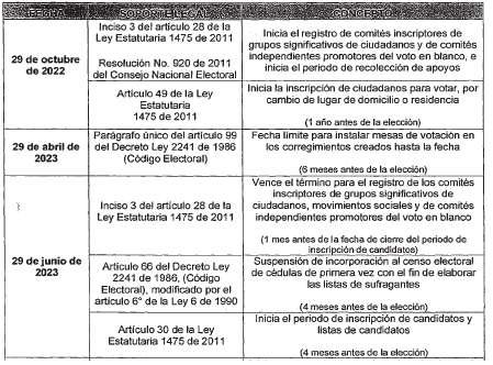 Que, de acuerdo con la normativa correspondiente, el 29 de octubre de 2023 se realizarán las elecciones de gobernadores, alcaldes, diputados, concejales y ediles o miembros de las juntas administradoras locales, siendo necesario establecer el calendario electoral.