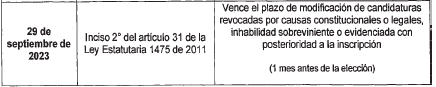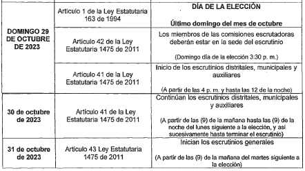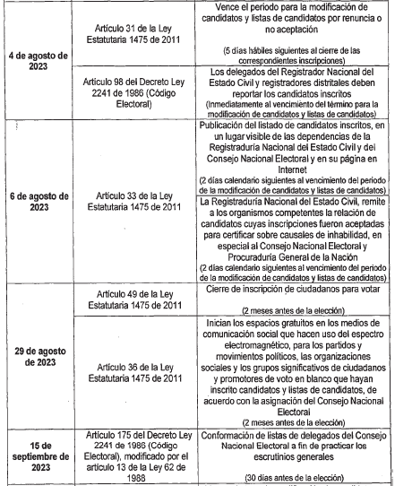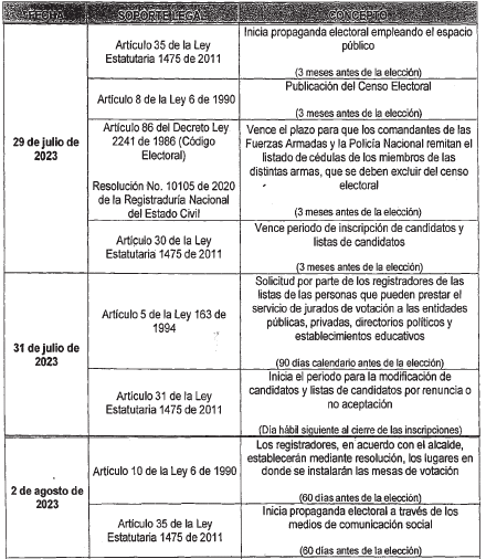ARTÍCULO 1o. Establecer el calendario electoral de las diferentes etapas preclusivas y actividades que se deben desarrollar para las elecciones de gobernadores, alcaldes, diputados, concejales y ediles o miembros de las juntas administradoras locales, que se realizarán el 29 de octubre de 2023, así: