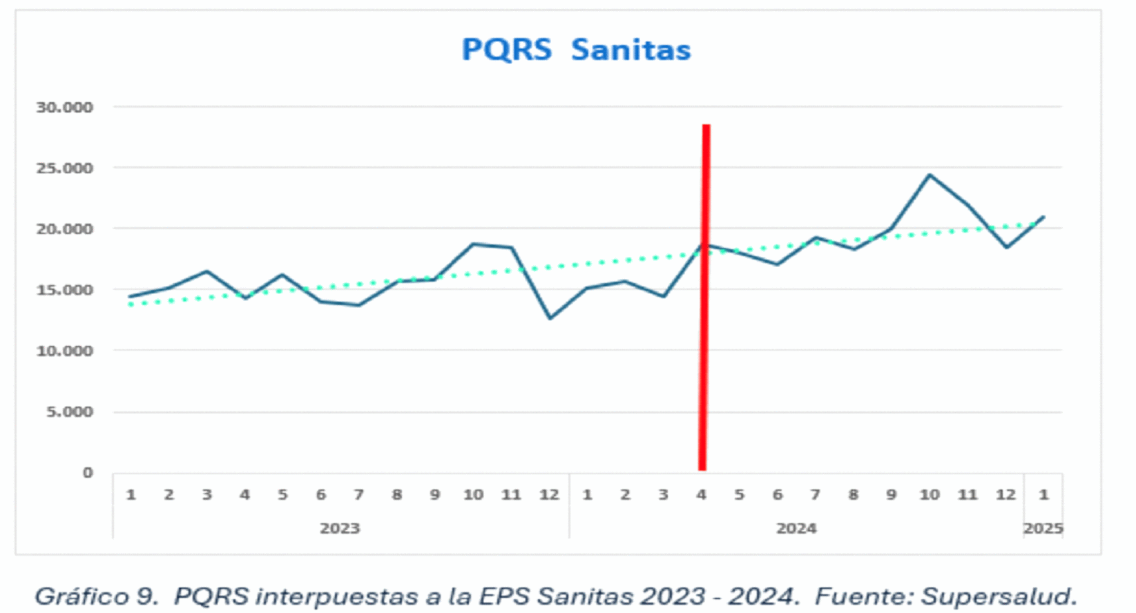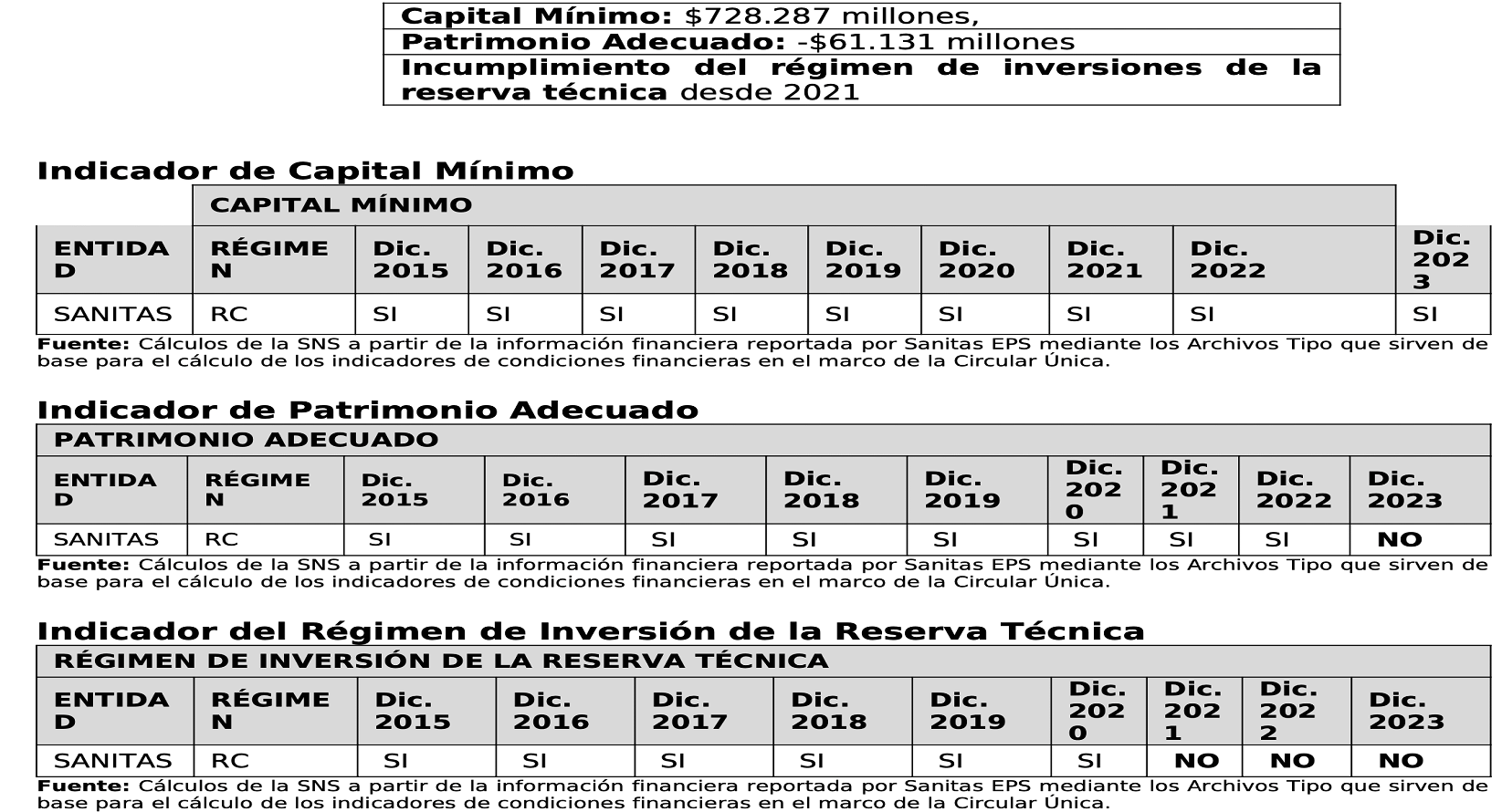 | El 2 de abril de 2024, la Delegada para las Entidades de Aseguramiento en Salud presentó ante el Comité de Medidas Especiales, un concepto técnico sobre EPS Sanitas que arrojó los siguientes resultados: Respecto de los tres indicadores de condiciones financieras y de solvencia (Capital Mínimo, Patrimonio Adecuado y Régimen de Inversiones de la Reserva Técnica), la EPS incumplió, para la vigencia de 2023, el correspondiente a Patrimonio Adecuado. En cuanto al Capital Mínimo, la EPS cumple con ese indicador en todas las vigencias. Ahora, respecto del Régimen de Inversiones de Reserva Técnica señaló un incumplimiento desde el cierre de la vigencia 2020 a 2023. Sobre el indicador de siniestralidad señaló lo siguiente: “[l]os resultados del indicador de siniestralidad PBS financiada con la UPC del Régimen Contributivo y la Movilidad del Régimen Subsidiado entre el cierre de la vigencia 2019 a 2023 aumentó en 11%, pasando del 92,9% al 103,9%”. Con corte a enero de 2024, EPS Sanitas presentó una tasa de reclamaciones en salud de “26.07” y “15.070”. Asimismo, destacó que “[e]n el marco de la auditoría realizada para verificación de la Resolución 497 de 202 -sobre criterios de habilitación para entidades de aseguramiento en salud- EPS SANITAS cumplió con el 57.6% de los estándares de habilitación y permanencia y registró 17 hallazgos”. De acuerdo con los anteriores hallazgos, la superintendente Delegada para las Entidades de Aseguramiento en Salud, en sesión del Comité de Medidas Especiales del 1 de abril de 2024, recomendó la toma de posesión inmediata de los bienes, haberes y negocios de EPS Sanitas por un año, así como la intervención forzosa para ejercer su administración. En ese orden, estimó que todo lo anterior ponía en riesgo la prestación del servicio de salud y a los afiliados, en cuanto a oportunidad y calidad, por lo que su recomendación propendía por garantizar dicho servicio y desarrollar el objeto social de la EPS. Causales del artículo 114 del Estatuto Orgánico del Sistema Financiero La Superintendencia Nacional de Salud destacó que la situación expuesta implicaba una vulneración de los derechos de los usuarios, así como el incumplimiento de las funciones indelegables de aseguramiento, lo que la facultaba para ordenar la toma de posesión de sus entidades vigiladas, de acuerdo con lo dispuesto en el régimen del Estatuto Orgánico del Sistema Financiero (EOSF). Por otro lado, la resolución citó un pronunciamiento del Consejo de Estad en el que se señaló que la toma de posesión procede cuando se presentan situaciones que afectan gravemente el interés público tutelado por la Superintendencia Nacional de Salud, específicamente, la correcta prestación del servicio de salud y la confianza en el sistema. De este modo, ante la configuración de alguna de las causales previstas en el artículo 114 del EOSF, aquella superintendencia tiene la obligación de verificar, de manera detallada y exhaustiva, los hechos que motivaron la medida. Asimismo, indicó que la adopción de las medidas de salvamento, establecidas en el artículo 113 del EOSF, es una decisión discrecional de la superintendencia, es decir, que dichas medidas no operan como requisito previo para la toma de posesión. La resolución expuso los siguientes incumplimientos por parte de la EPS: Acatamiento del 28.6% de los estándares de cumplimiento. Lo anterior refleja un déficit en cuanto al cumplimiento de los estatutos y los parámetros de organización de la EPS. Cumplimiento del 25% de la prestación efectiva de servicios y tecnologías en salud. Por su parte, la red de prestadores de servicios en salud muestran un 0% de cumplimiento. Un indicador de 40% de cumplimiento en la política de contratación y pagos. Asimismo expuso las siguientes falencias de la EPS: Las deudas con las IPS, para diciembre de 2023, ascendían a la suma de $ 2.043.289.989.569, lo que pone en riesgo la prestación del servicio a sus afiliados y de todos los usuarios de las redes acreedoras. Incremento progresivo de la tasa de siniestralidad, desde 2019 hasta 2023, por encima del 100%, lo que implica un aumento en los costos de salud respecto de los ingresos operacionales. En 2023 se reportaron 185.634 reclamos, con una tasa de incidencia de 321.25 por cada 10.000 afiliados, lo que supera el promedio nacional. Vulneración sistemática de los principios de continuidad, disponibilidad, accesibilidad y oportunidad en la prestación del servicio de salud (artículo 6 de la Ley 1751 de 2015). Aumento alarmante de los reclamos, con un total de 185.634 para 2023, cuya tasa de reincidencia fue de 321.25 por cada 100.000 afiliados, lo que supera, de manera significativa, el promedio nacional. Para 2023, se produjo un reporte de 15.088 acciones de tutela (sin precisar si a favor o en contra) interpuestas por los usuarios. A enero de 2024, la tendencia referida continuó con 15.070 reclamaciones nuevas. Las principales razones de dichos reclamos obedecen a las deficiencias en la asignación oportuna de citas y consultas médicas; la entrega de tecnologías en salud; así como en la autorización y atención de otros servicios de salud. Configuración de la causal consagrada en el literal i) del artículo 114 del EOS, sobre requerimientos mínimos de capital de funcionamiento, de acuerdo con el estudio técnico realizado por la Delegada para las Entidades de Aseguramiento en Salud con corte a diciembre de 2023. Dicha causal corresponde al incumplimiento del Capital Mínimo. Para lo anterior, se expuso la siguiente gráfica: ![]() La aludida resolución señaló que la configuración de la causal debe interpretarse de acuerdo con los estándares normativos del Sistema General de Seguridad Social en Salud y del Decreto Único Reglamentario del Sector Salud y Protección Social 780 de 2016 (artículo 2.5.2.2.1.). Asimismo, resaltó que lo anterior reflejaba el deterioro de la EPS en los co