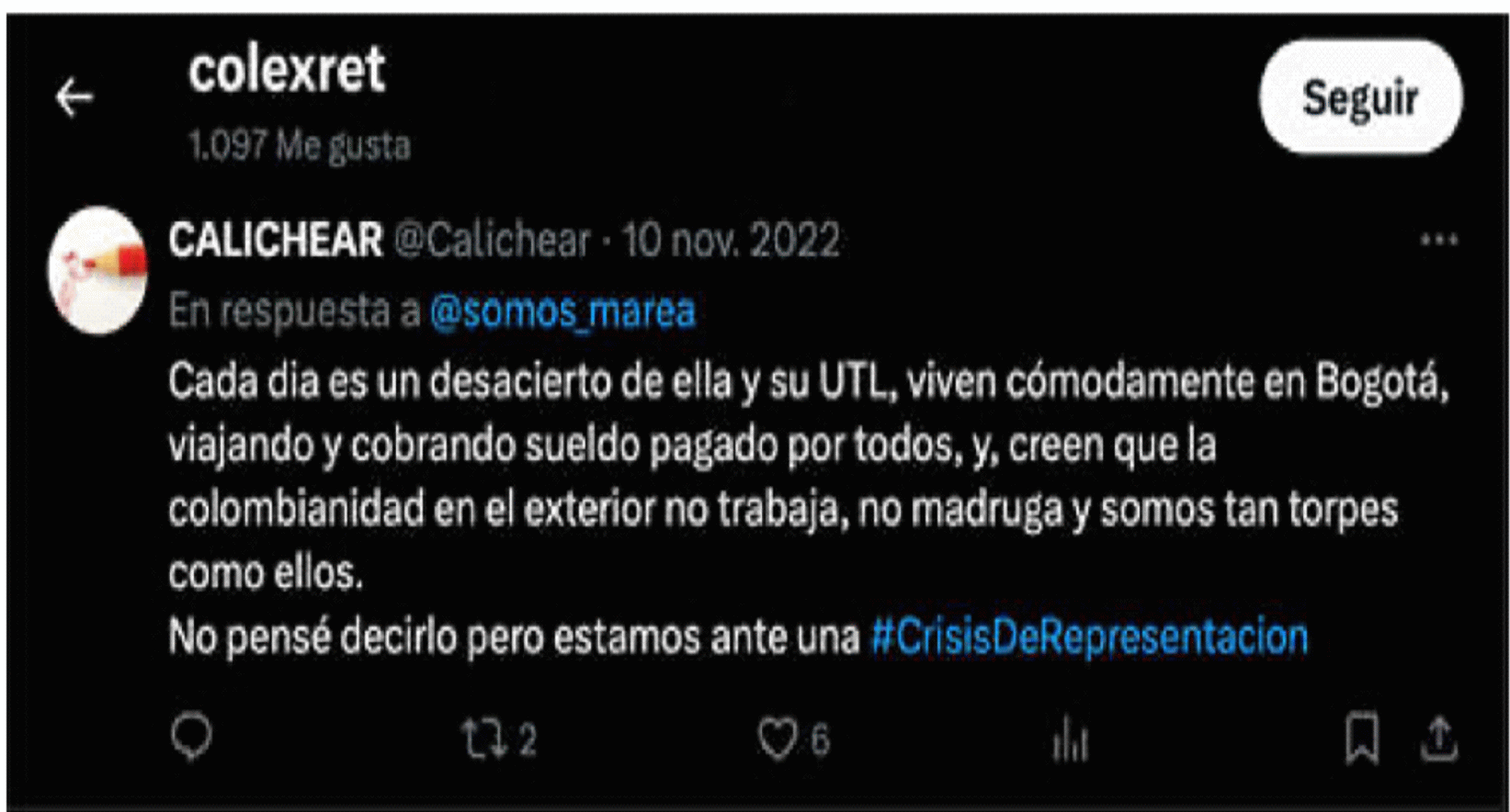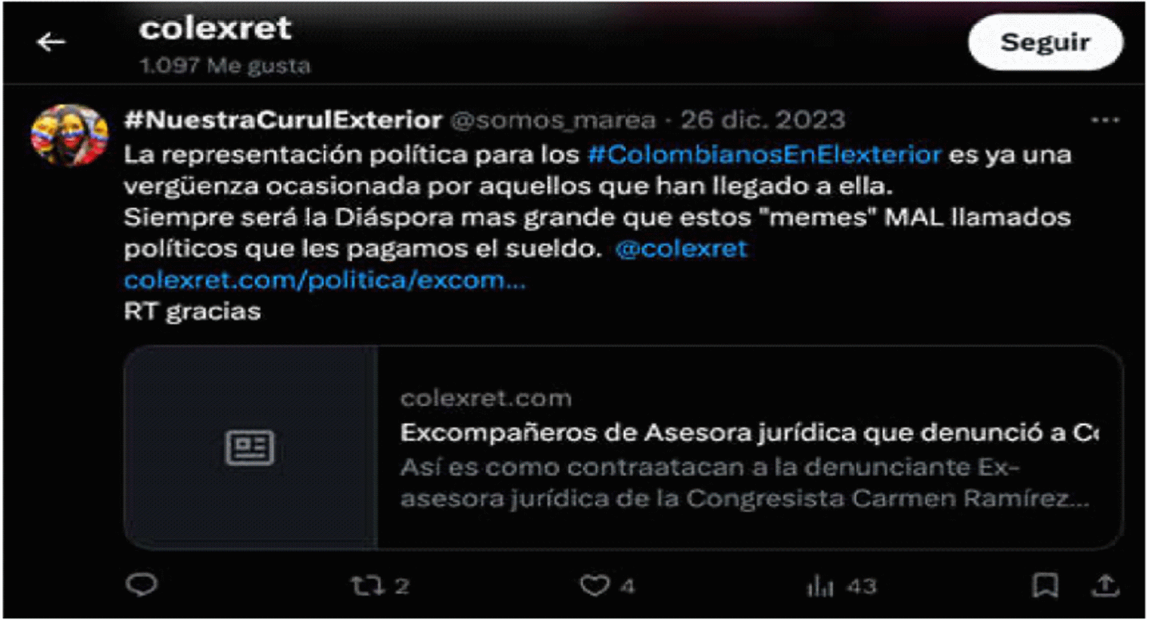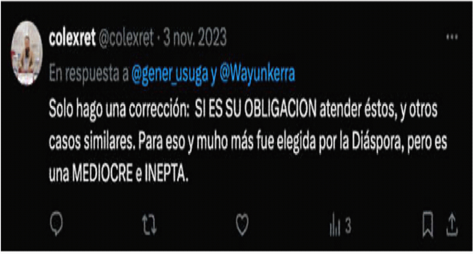| “Para eso y mucho más fue elegida por la Diáspora, pero es una mediocre e inepta”. | Red social X – Perfil de COLEXRET | Este mensaje fue publicado por el actor el 3 de noviembre de 2011, en el marco de un hilo de publicaciones en X sobre el artículo denominado “Con mentiras y amenazas Congresista elude prestar ayuda a colombiana fallecida en el exteriorhttps://www.colexret.com/politica/con-mentiras-y-amenazas-congresista-elude-prestar-ayuda-a-colombiana-fallecida-en-el-exterior/, columna de opinión que fue divulgada el 1 de noviembre de 2023 en el sitio web de COLEXRET. En el artículo, el actor asegura que la accionada afirmó no poder prestar apoyo, ayuda y acompañamiento a los familiares de una ciudadana colombiana que falleció en un accidente de tránsito en Estados Unidos, en razón a la situación migratoria en la que se encontraba la mujer fallecida. Al respecto, refiere que el comportamiento de la congresista denota “ineptitud, mediocridad , falsedad, mentira ignorancia” y desconocimiento de la normativa migratoria. | |